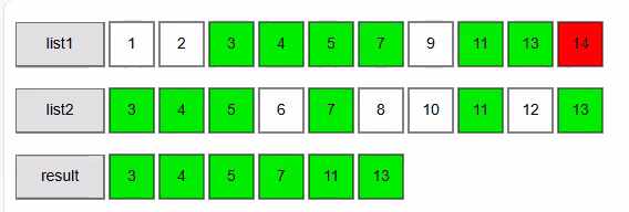 - i1=8:13, i2=9:13 → equal → add 13, advance both → matches: [3, 4, 5, 7, 11, 13]