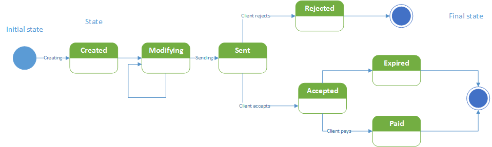 As you can see, with only these 2 elements we can express a lot already. We see immediately that when an invoice has been sent, it can’t be modified anymore. We also see that there currently are no actions when an invoice is expired or rejected, which may indicate that our analysis is incomplete.