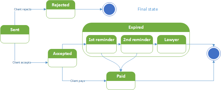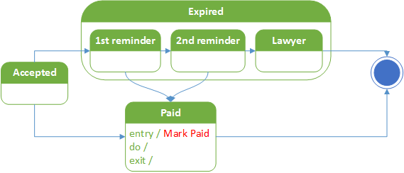 When an invoice is expired we may want to send a reminder, then maybe a second reminder, and then send the invoice to our lawyer. This can all be part of the expired state. So we can make this a composite state, containing sub states. The diagram shows it all. And of course we can do the same with the rejected state.