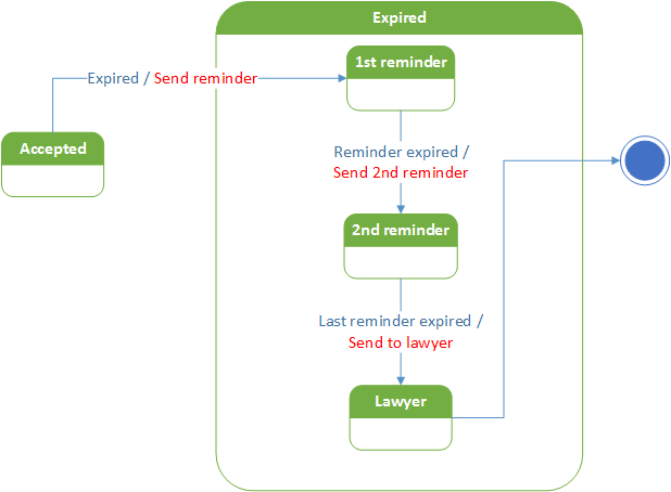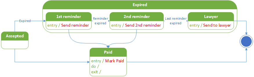 But it is clear that often this action will always need to be performed when we get into the “1st reminder” state. So it would be a better idea to put “Send Reminder” as an entry action for this state. That way, when in the future we find more transitions to “1st Reminder” we’re always certain that a reminder will be sent in any case!