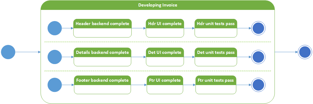 But we don’t necessarily need to do all these 3 tasks one after the other. Maybe we have 3 developers, who can work simultaneously on the software. In that case each developer can run through his states (backend – UI – unit tests), and the invoice software will be complete when all the 3 trajectories are ended.