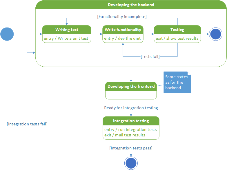 We start by writing the backend, after which we write the front end. We then perform the necessary integration tests and if all goes well the unit is finished. So that is the (sequential) happy path.